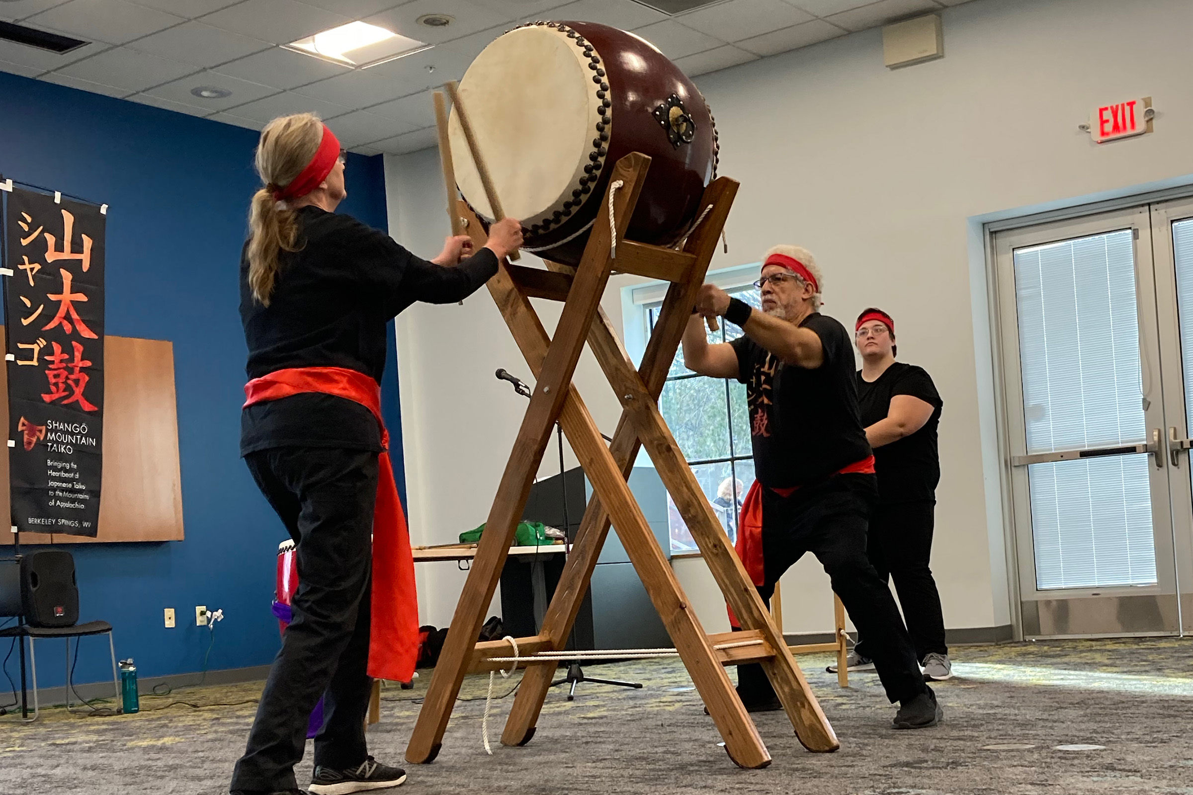 Joan performs O-Daiko at a presentation at Burr Arts Library in Frederick, MD, November 2023.