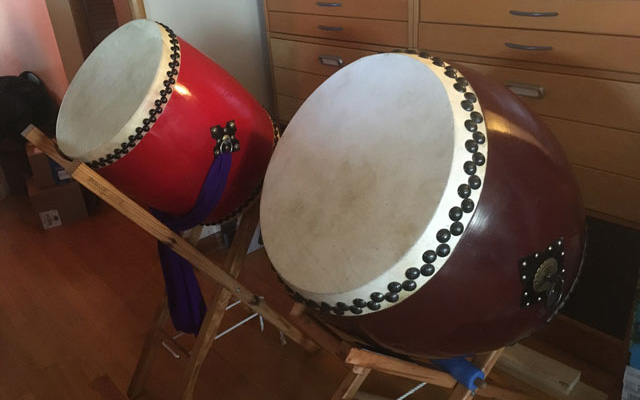 Shangö’s small 17" Eisa-Odaiko and his “Big Brother”, an 21" Okinawan Nagado Chu-Daiko.