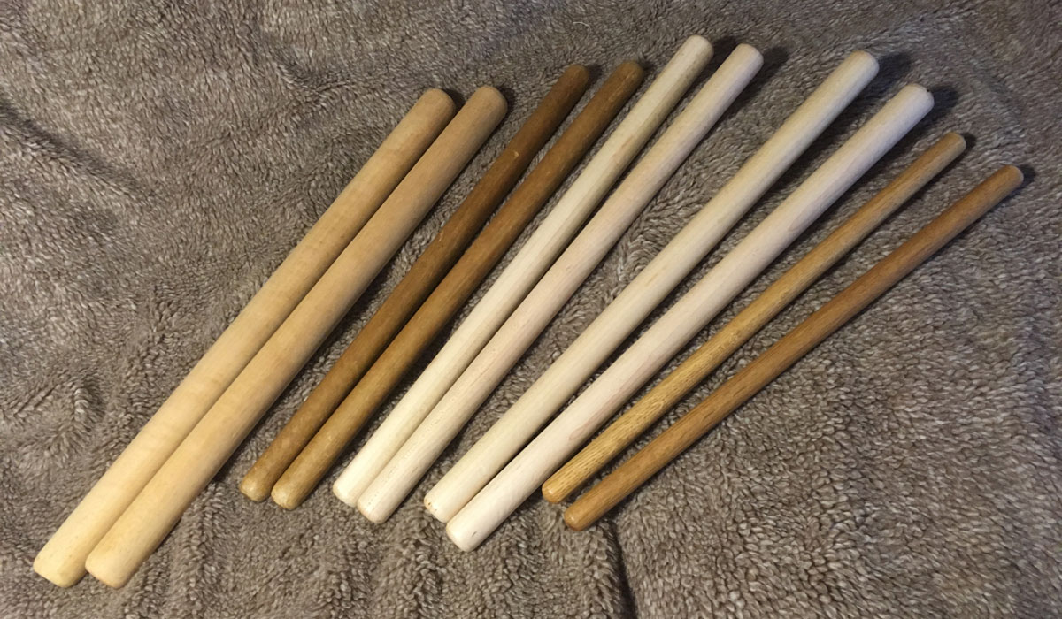 Bachi – drumsticks. From Left, Odaiko-bachi. Homemade and standard chudaiko-bachi, shime-bachi cut down from standard kit drum sticks.