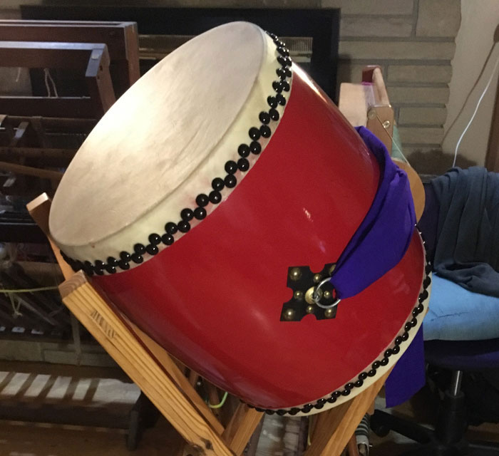 Nagado Daiko – in 2020, Shangö cooperatively purchased a second large nagado chu-daiko drum to add to our arsenal. We hope to cultivate more players. Left. 17" Eisa-odaiko. Right. 24" Nagado-daiko.