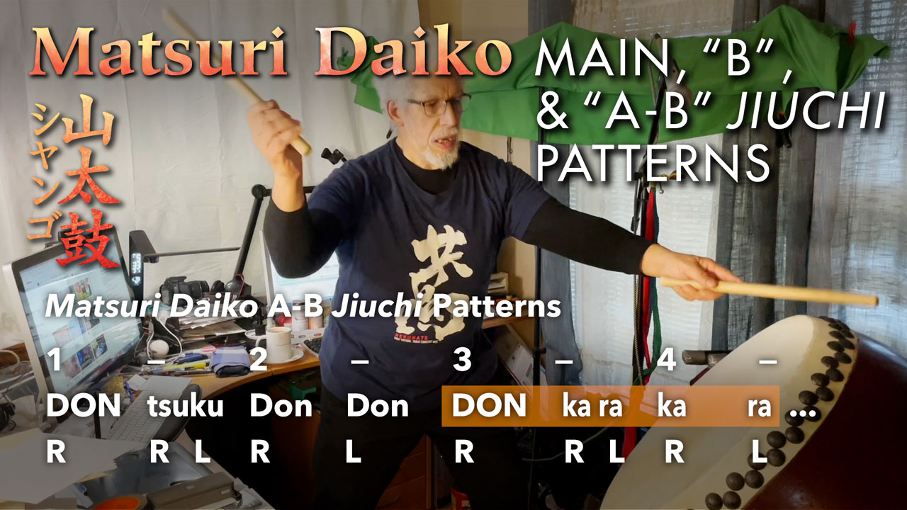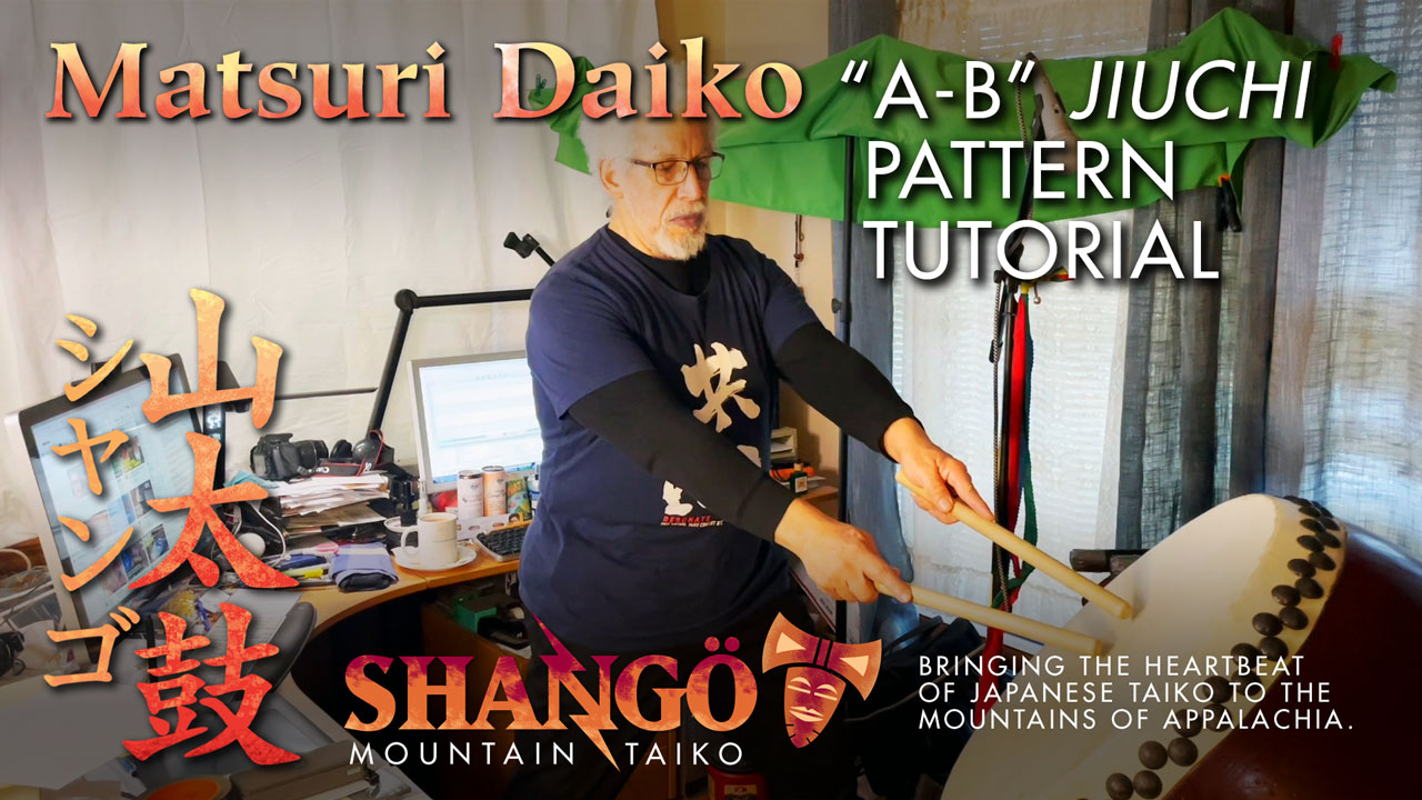 Matsuri Daiko – Main, “B”, &anp; “A-B” Juichi Patterns – For the Shangö Mountain Taiko Trainees. Excerpt from the full-length “Matsuri Daiko “A-B” Jiuchi Pattern Tutorial.” The jiuchi patterns demonstrated. The Main Pattern, the “B” Pattern, and the “A-B” Pattern – for reference.